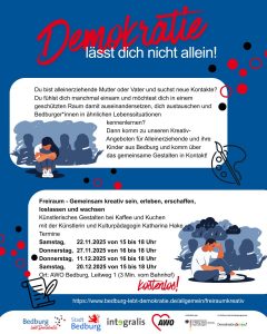 Im Rahmen unserer Reihe “Demokratie lässt dich nicht allein” bietet Katharina Hake, Künstlerin und Kulturpädagogin ein tolles kreatives Projekt an, das sich gezielt an Alleinerziehende richtet. An vier Terminen können die alleinerziehenden Eltern mit ihren Kindern gemeinsam kreativ werden, in den Austausch kommen und für sich selbst etwas Schöne gestalten.
